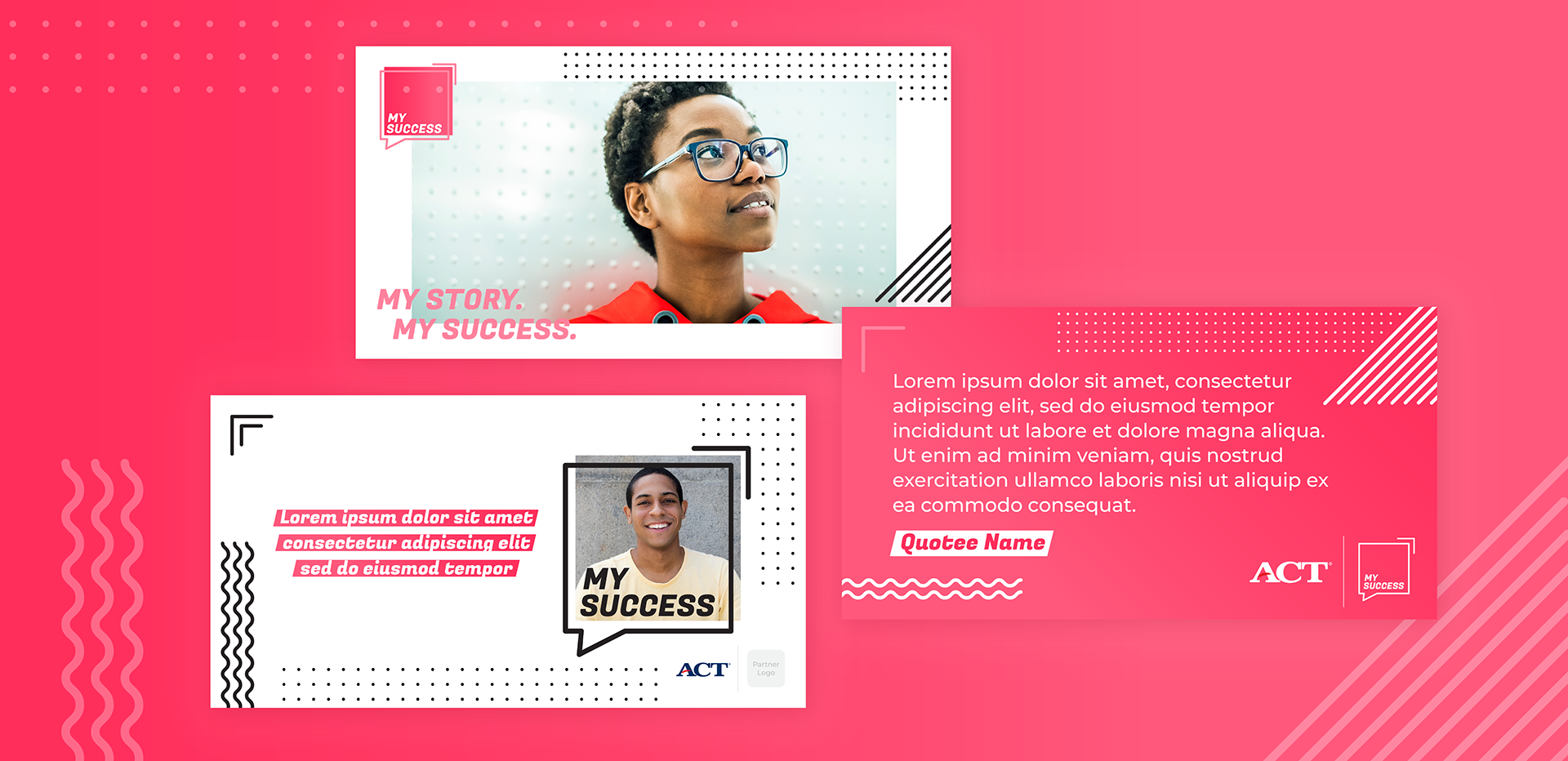 My Success is and initiative created by ACT Testing to connect with students. The My Success campaign highlights the unique paths students take to achieve their own success after graduating high school. My Success provides resources for students planning their next steps post high school and encourages them to share their journey to success. For this campaign I created the logo, brand assets, print collateral and social media templates.
