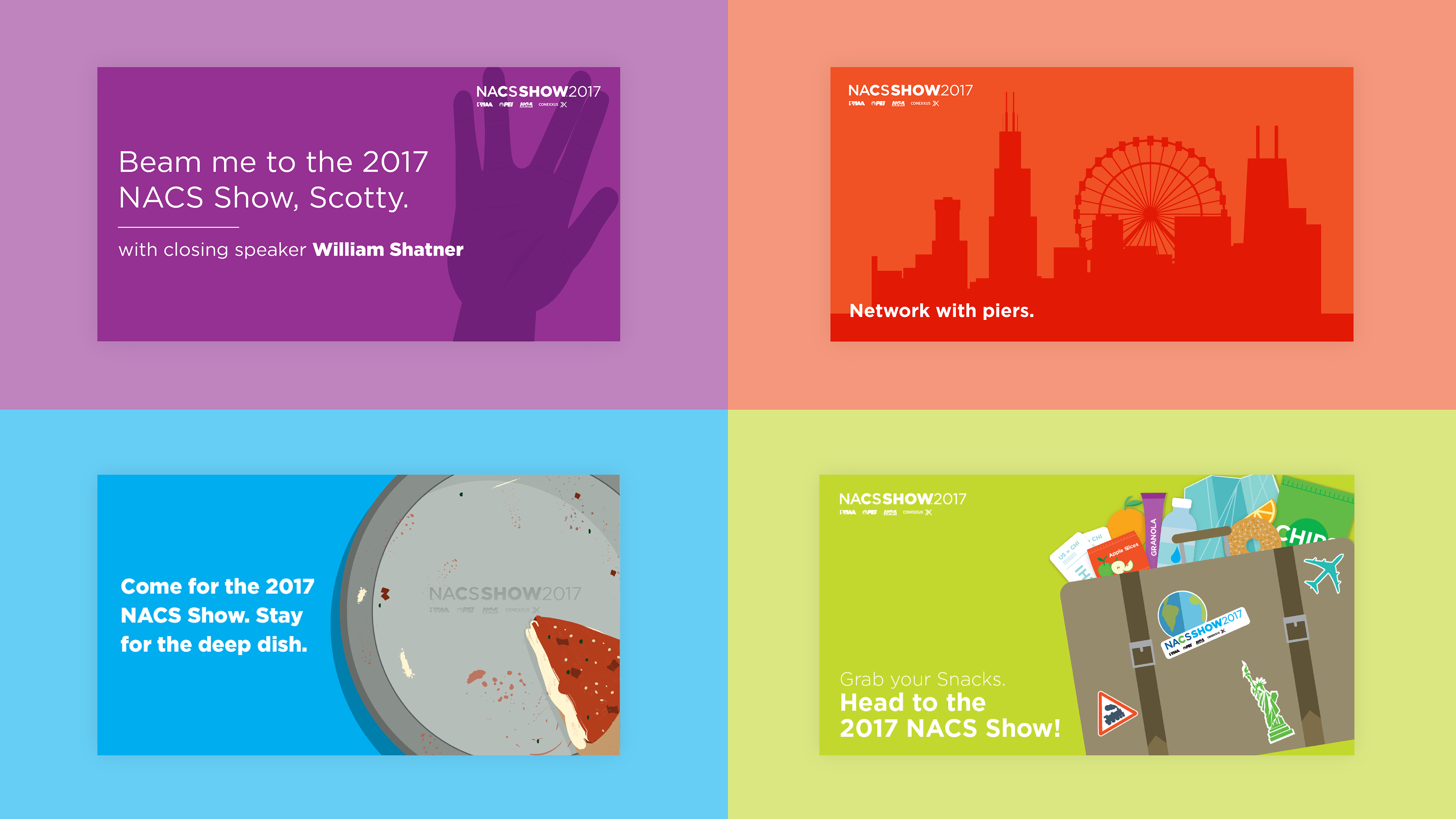 This is a collection of campaign visuals supporting event promotion of the 2017 NACS Show. NACS, National Association for Convenience Stores, hosts a convention every year bringing together people from the convenience industry across world. The 2017 show was in Chicago and focused on three main areas; building a network, learning new ways to improve your business and showcasing new products set to hit the shelves soon. I worked with a team at NACS to develop eye catching visuals for both an organic and paid social media campaigns.